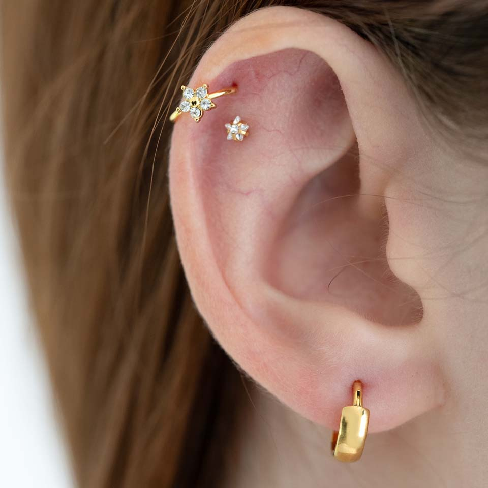 Dieser zierliche Ring aus Chirurgenstahl ist mit einer zierlichen Blume versehen, die aus fünf Edelsteinblättern um eine zentrale Perle besteht. Erhältlich in goldener oder silberner Ausführung, ist dieser Ring aus Chirurgenstahl gefertigt und somit stabil, langlebig und anlaufgeschützt. Mit seinem dünnen Gewinde (0,8 mm / 20 g) eignet sich dieser Ring ideal für Nasenpiercings, kann aber auch in Helix- und anderen Ohrpiercings getragen werden. Drehe ihn einfach zum Öffnen, führe ihn in dein Piercing ein und drehe ihn erneut, um ihn zu sichern.