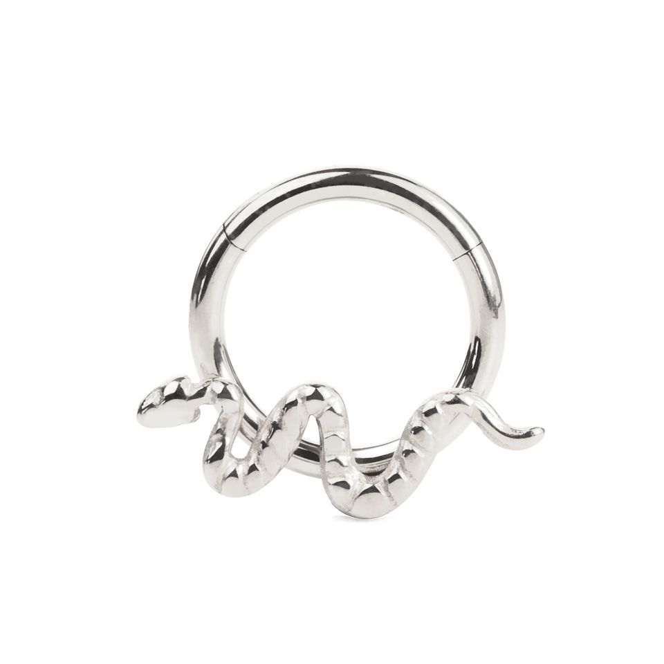 Einzigartig an diesem Ring ist das stilvolle Schlangendesign, das die Vorderseite ziert. Beachte die Position der Schlange auf diesem Ring, wenn du überlegst, für welches Piercing du den Schmuck brauchst.