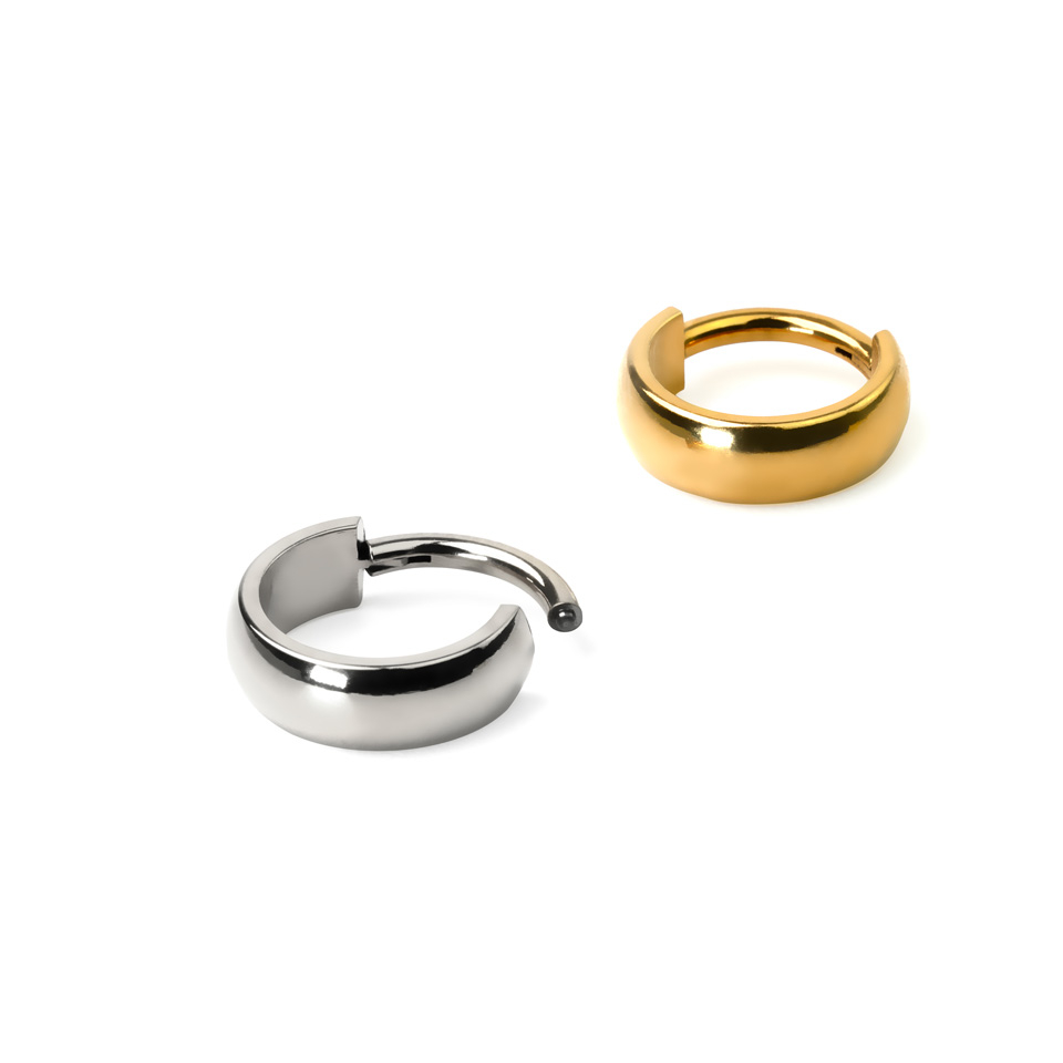 Dieser Scharnierring aus Titan zeichnet sich durch einen großen, nach außen gerichtetem Bogen und ist ein echter Hingucker. Er kommt in 4 Farben: Silber, schwarz, rotgold und gold.