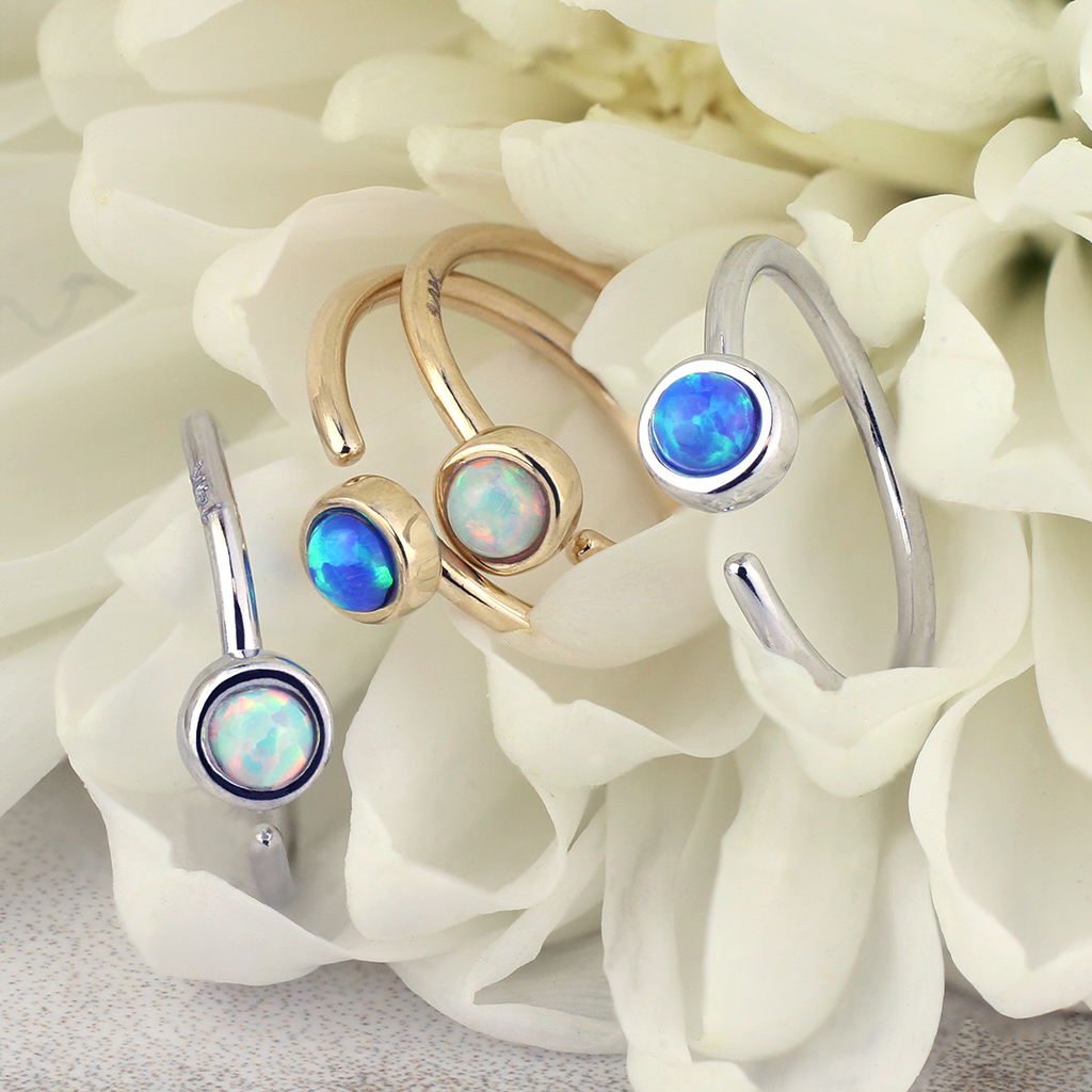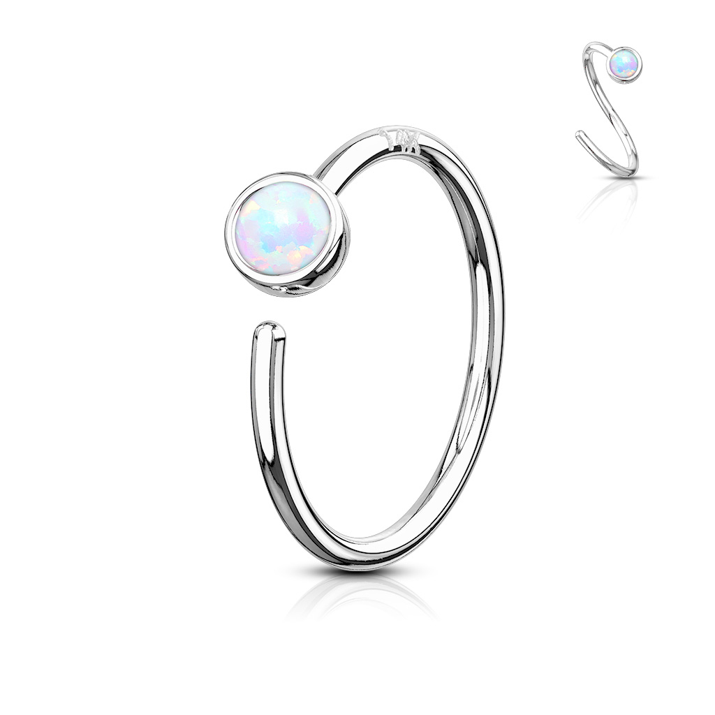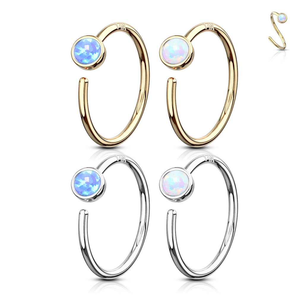 Dieser Ring besteht aus massiven 14 Karat Gold. Hier hast du die Auswahl zwischen der traditionellen Gelbgold- oder der etwas stärker gedimmten Weißgold Variante. Beide Versionen kommen in 14 Karat. Hier handelt es sich um einen endlos Ring, somit befinden sich keine sichtbaren enden an diesem Schmuck. Es gibt jedoch eine kleine Öffnung, da andernfalls der Schmuck nicht in das Piercing eingeführt werden kann. Die Enden des Rings sind leicht verdreht, somit ist der Ring wie ein Twister-Ring geformt. Auf dem Ring befindet sich ein hübscher 2,5 mm breiter Opalstein, hier handelt es sich jedoch um einen synthetischen Stein. Neben der Materialwahl kannst du auch die Steinfarbe selbst wählen, zur Auswahl stehen weiß oder blau. Der weiße Opal weist Farbtöne auf, die von Rot über Gelb bis hin zu Grün reichen, der gesamte Stein erscheint jedoch weiß. Der blaue Stein haftet an den Blautönen wie hellblau, türkis und dunkelblau.