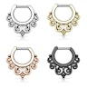 Dieses Modell haben wir in vier verschiedenen Farben und du kannst entscheiden ob dir das blanke, goldene, rotgoldene oder dunkelgraue Modell am ehesten zusagt. Alle Modelle sind einzigartig schön in einem Septumpiercing anzusehen.