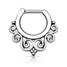 Schmück dein Septum mit weichen Rundungen, die sich wie ein S-geformtes Muster auf der Unterseite dieses Schmuckstücks schlängeln. Dieses verschnörkelte Muster ist vollständig symethrisch und hat zwei große schöne Bögen, die sich in der Mitte treffen und mit drei kleinen Kugeln abschließen.