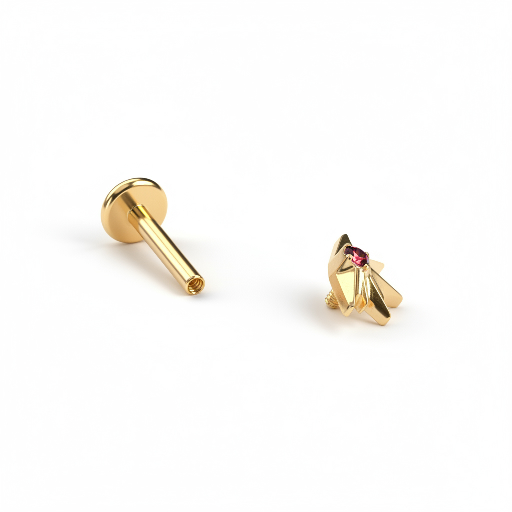 Der Titan-Sonnenuntergang-Labret ist perfekt für Augenblicke, die länger nachklingen als der Tag. Ein halbsonniges Design mit gezacktem Schmuckstein, wahlweise in Rot oder Transparent. In goldener oder silberner Farbe erhältlich, begleitet er dich jederzeit.