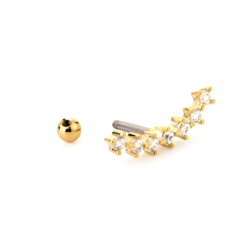 Ein toller Ohrschmuck rundet jeden Look ab, und wenn du etwas auffälligeres brauchst, ist dies das richtige Accessoire für dich. Diese gebogene Stabspitze funkelt wie eine Sternenreihe am Nachthimmel. Dieses Schmuckstück zieht allein schon genug Aufmerksamkeit auf sich, ist aber auch eine perfekte Ergänzung zu der anderen Schmuckkombinationen. Zum Beispiel kannst du es in einem Helix-, Conch- oder auch in einem Ohrläppchen Piercing verwenden. Du kannst es beliebig oft ausprobieren und verschiedene Kombinationen kreieren.