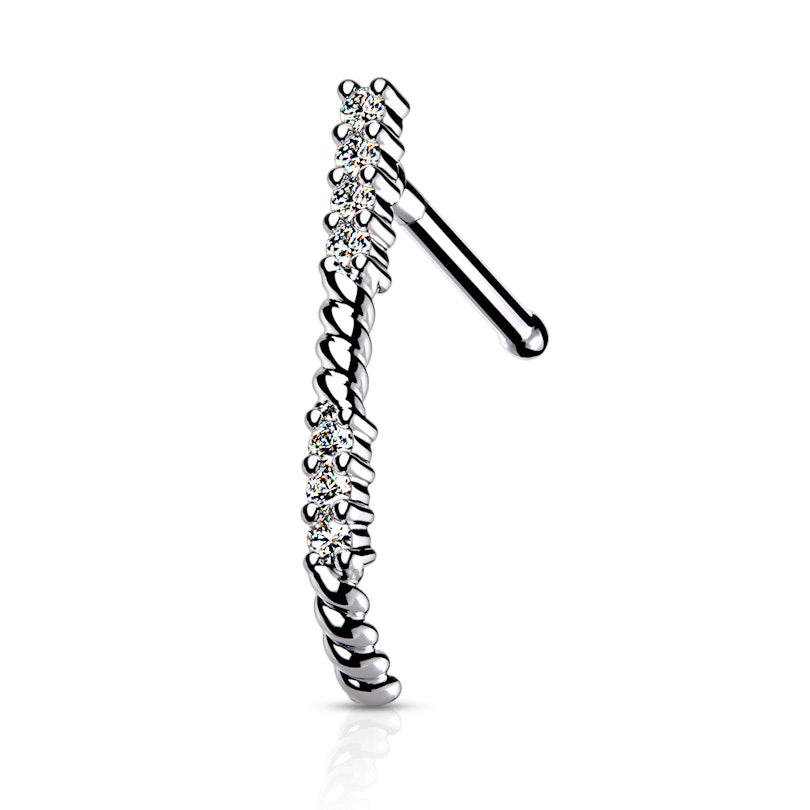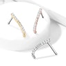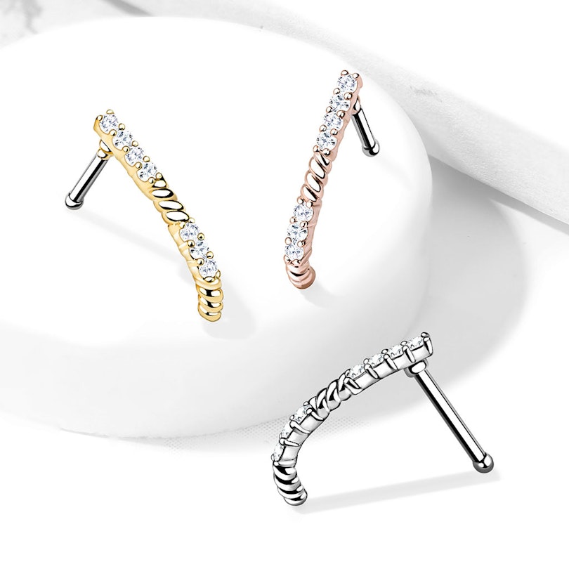 Chic. Einzigartig. Das sind die Adjektive, die dieses erhabene, mit Steinen verzierte Schmuckstück beschreiben. Die Gesamtlänge dieses einzigartigern Crawlers beträgt 13 mm. Er ist in drei verschiedenen Farben erhältlich: Gold, rotgold und silber. Die Stabstärke dieses Steckers misst 0,8 mm, bei einer Länge von 6 mm. Dies sind Standardmaße für einen Nasenlochpiercing. Ein sehr interessanter Schmuck, der in keiner Nasenschmuck-Kollektion fehlen darf.