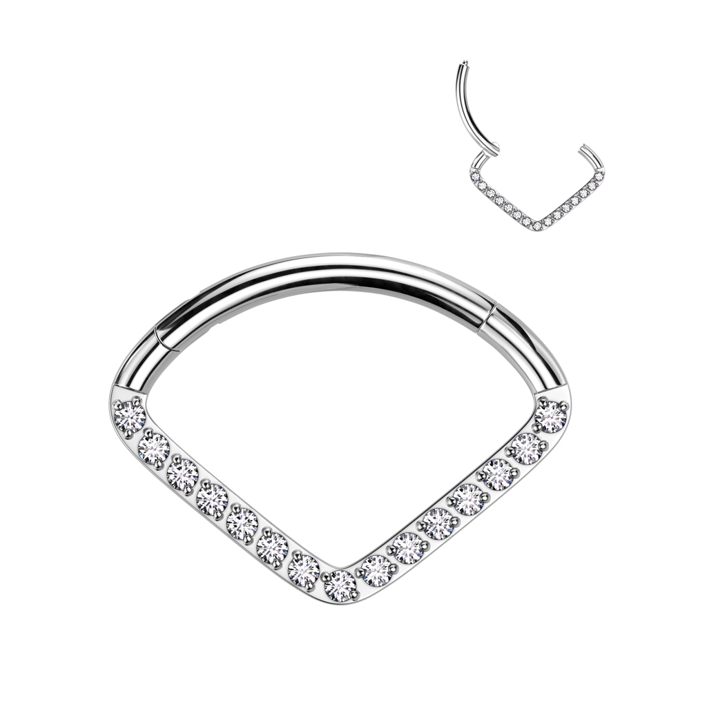 Lust auf Glitzer und Glanz? Hier bist du an der richtigen Adresse. Dieser wunderschöne Ring hat ein zeitloses Chevron-Design, bei dem der abgewinkelte Teil mit klaren Zirkoniasteinen besetzt ist. Der gebogene Teil, der in das Piercing gesteckt wird, sorgt natürlich für optimalen Tragekomfort. Dieser Ring verleiht dir die perfekte Prise Glamour, ein garantierter Blickfang.