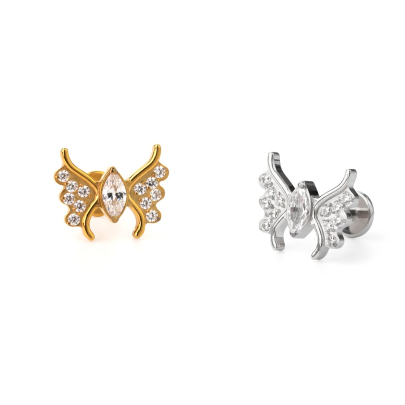 Dieses detailreiche Labret hat die Form eines wunderschönen Schmetterlings. Der Körper wird durch einen ovalen CZ-Stein in Lünettenfassung dargestellt, und die zarten Flügel sind mit 6 kleinen Steinen besetzt. Der aus Titan gefertigte Schmuck ist langlebig und hypoallergen, und dank des Innengewindes ist das Einsetzen und Herausnehmen aus dem Piercing sehr einfach und bequem. Mit diesem Schmetterling kannst du deine Ohrpiercings charmant ergänzen.