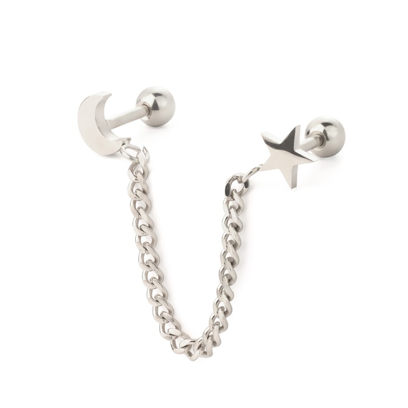 Der Schmuck besteht aus zwei Stäbe, die durch eine Kette verbunden sind. Jeder Stab ist 1,2 mm dick und 6 mm lang. Auf der Rückseite befindet sich eine 4 mm lange Verriegelungskugel. Auf der Vorderseite haben sie einen Stern bzw. einen Halbmond.