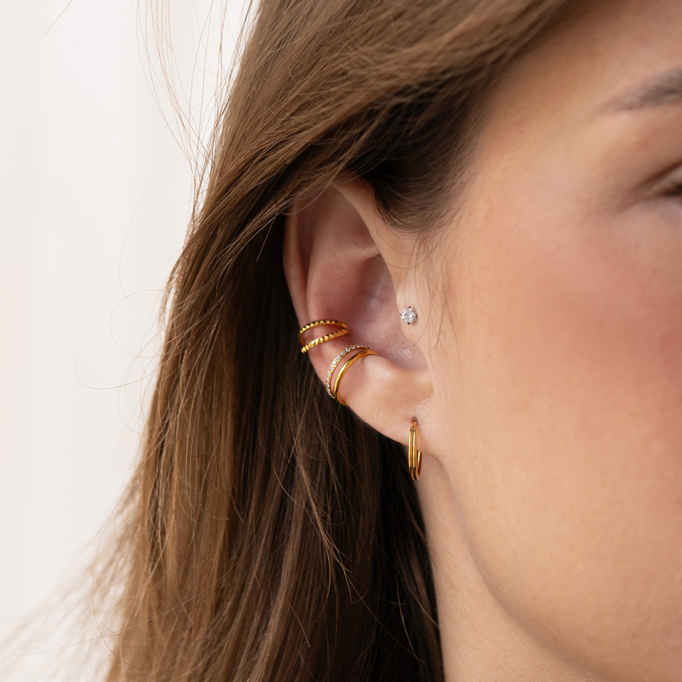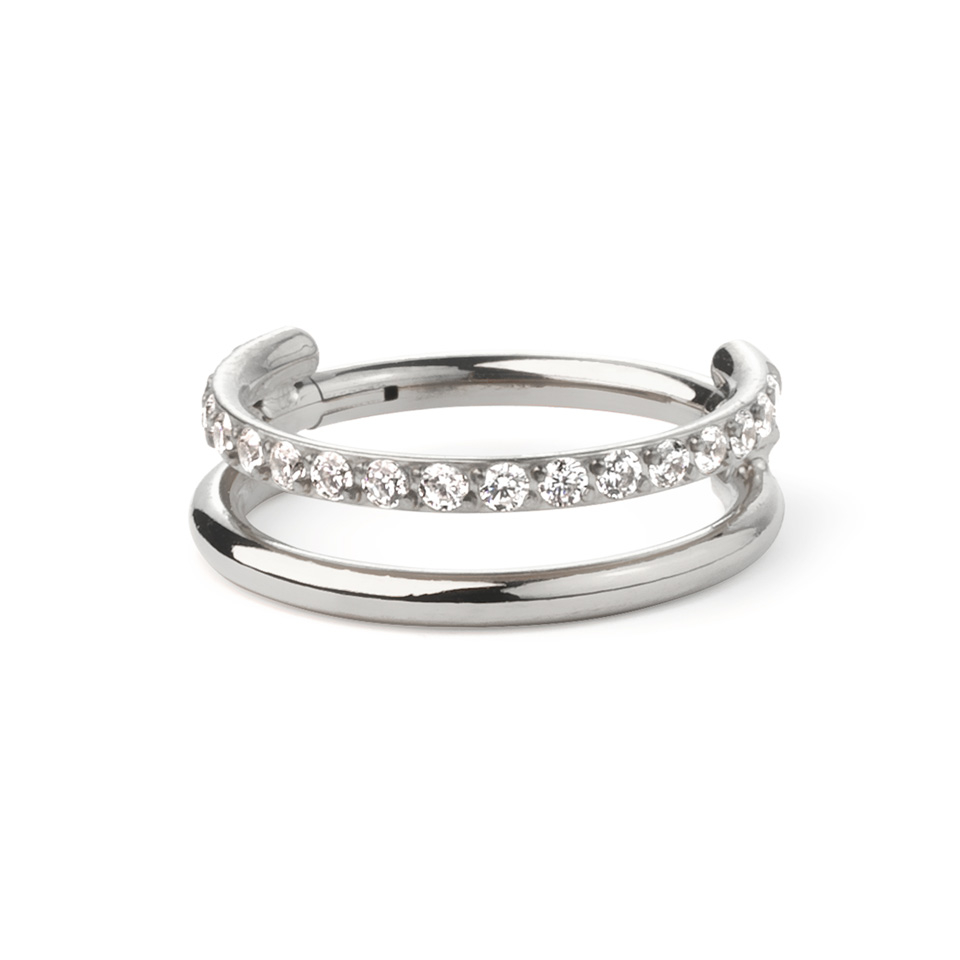 Dieser ungewöhnliche Schmuck wirkt wie zwei Ringe, einer besetzt mit kleinen Edelsteinen und einer ganz ohne. Die zwei Ringe sind mit einem einzigen Faden verbunden, der in dein Piercing geht. Der aus Titan gefertigte Ring ist hypoallergen und sehr robust. Er ist in verschiedenen Durchmessern und mit Gold- oder Silberbeschichtung erhältlich. Dieser schöne Ring eignet sich für zahlreiche Ohrpiercings und ist eine schicke Ergänzung zu deinem Ohrstapel, egal wo du ihn trägst.