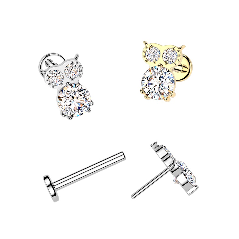 Titan-Labret in Eulenform mit Schmucksteinen verleiht deinen Ohrpiercings das gewisse Etwas. Die Eulenform ist fein ausgearbeitet und mit mehreren Schmucksteinen in einer ordentlichen Krappenfassung besetzt, wodurch das Design Textur bekommt, ohne überladen zu wirken. Erhältlich in den Farben Gold- und Silber, passt es super, wenn du etwas ausdrucksstarkes suchst statt etwas minimalistisches.