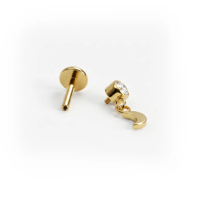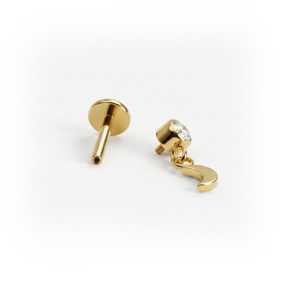 Das Titan-Labret mit Mondanhänger besticht durch sein schlichtes Design: oben sitzt ein Schmuckstein in Zargenfassung und direkt darunter hängt ein kleiner mondförmiger Anhänger. Das hängende Detail bringt ein bisschen Dynamik und passt perfekt allein oder in Kombination mit anderen Schmuckstücken. Erhältlich in den Farben Gold und Silber.