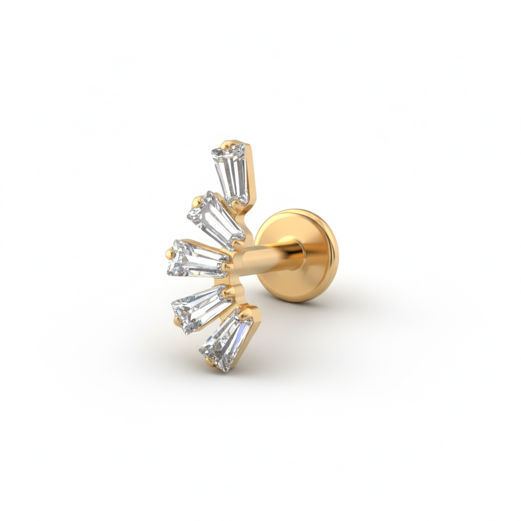 Das Titan-Labret mit Steinen im Baguetteschliff passt perfekt zu Momenten, die klare Struktur verlangen. Die präzise angeordneten Steine sorgen für einen harmonischen Look am Ohr.