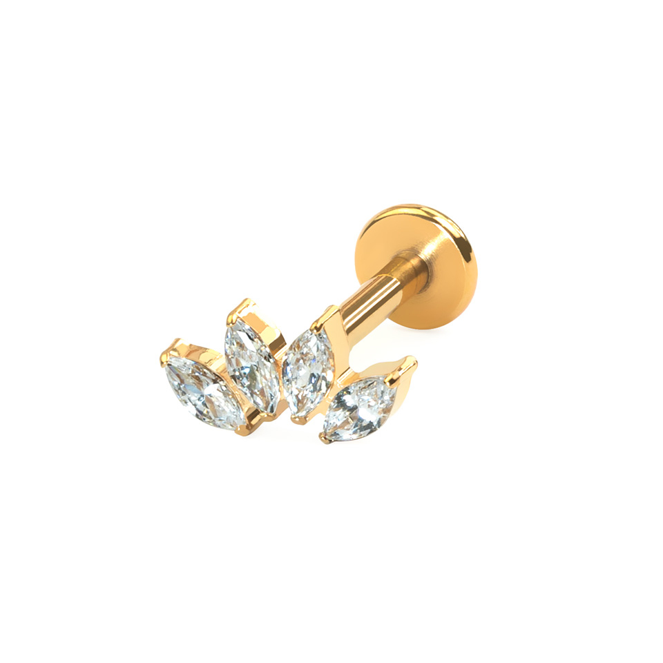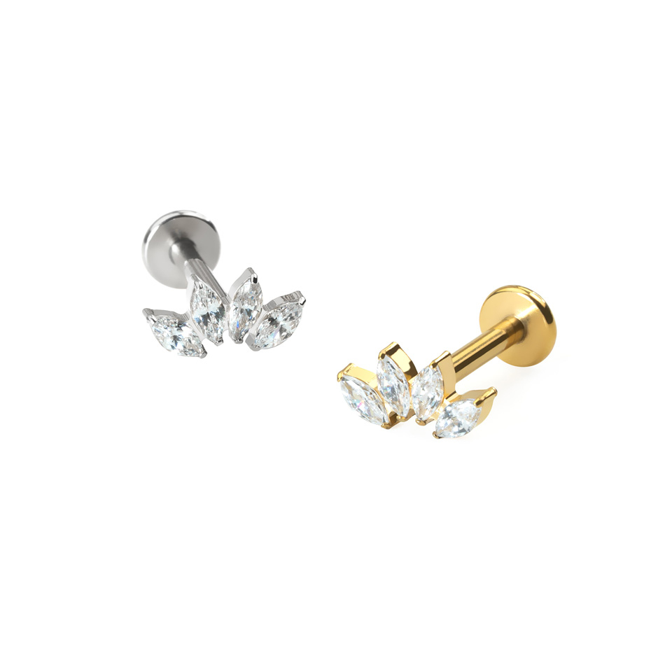 Dieses elegante Labret besteht aus 4 gebogenen CZ-Steinen im Marquiseschliff. Es eignet sich ideal für verschiedene Ohrpiercings und passt besonders gut zu einem Conch- oder flachen Piercing. Der Schmuck ist mit einem Innengewinde versehen, d.h. du steckst einfach den glatten Stab durch dein Piercing und schraubst den Aufsatz auf. Es ist aus Titan gefertigt, so dass es auch für Menschen mit empfindlicher Haut angenehm zu tragen ist.