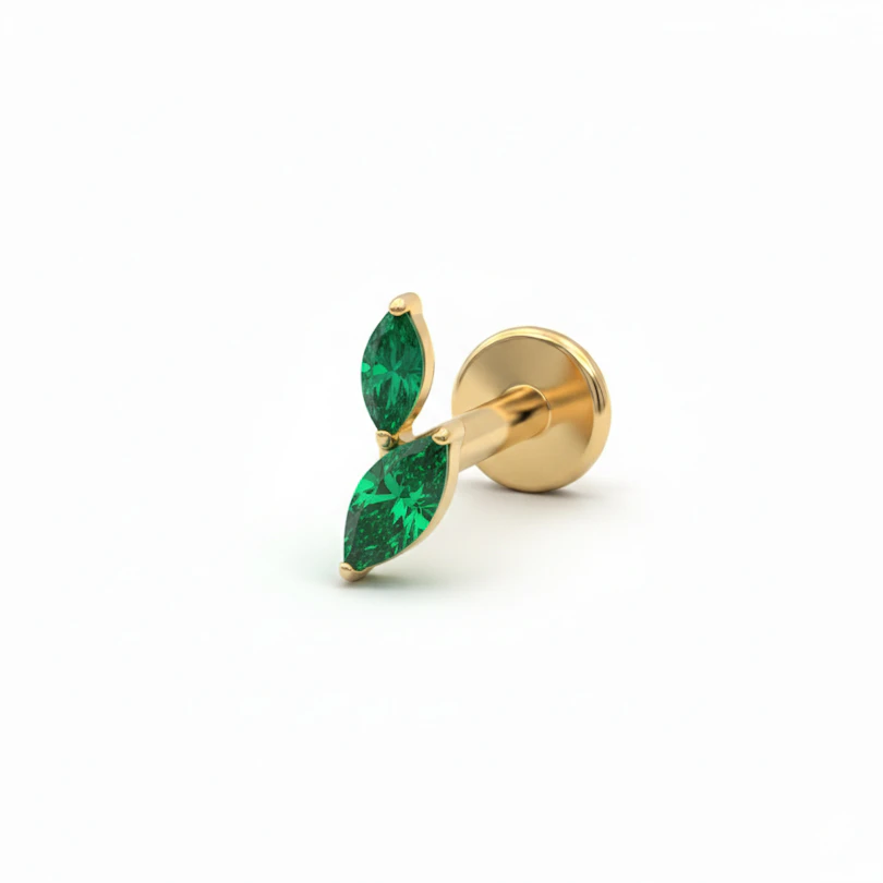 Das Titan Labret mit zwei marquiseförmigen Steinen zeigt, dass weniger oft mehr ist. Die beiden schlanken Schliffe sitzen wie Blätter oder Flügel nebeneinander und verleihen deinem Ohr subtilen Schwung, ohne den Look zu überladen.