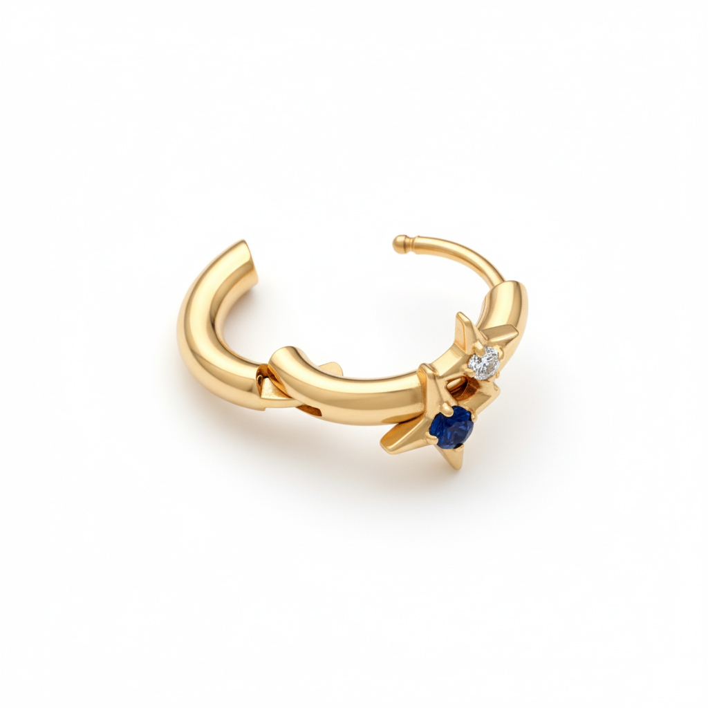 Titan-Ring mit zwei Sternen verleiht der klassischen Huggy-Form eine verspielte Note. Zwei kleine Sternchen sitzen nebeneinander, jeweils mit einem farbigen Schmuckstein in einer feinen Krallenfassung und verleihen dem Ring genau genug Charakter, ohne überladen zu wirken. Erhältlich in goldener und silberner Farbe, lässt er sich einfach mit dem restlichen Schmuck auf deinem Ohr kombinieren.
