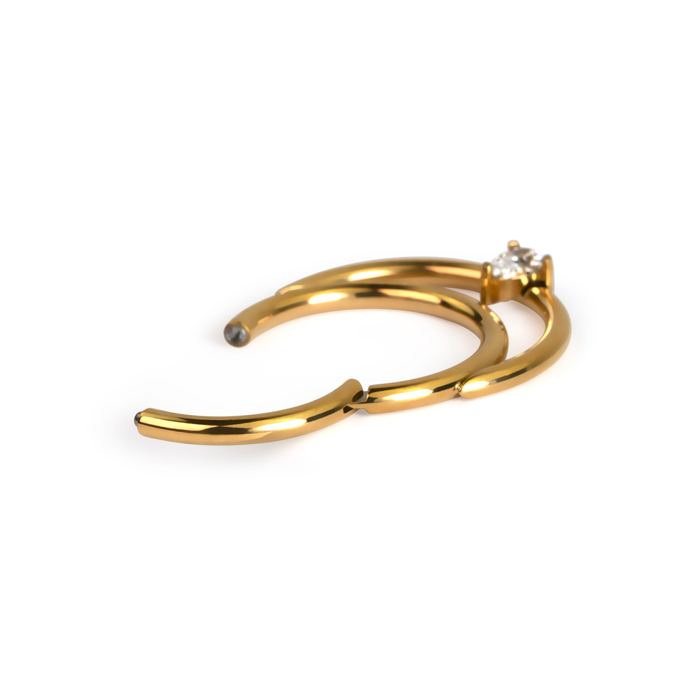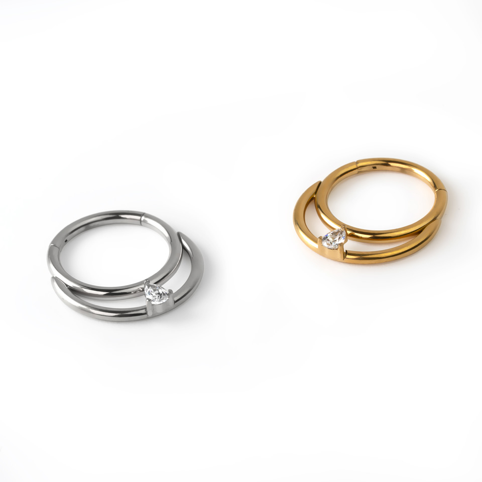 Titan-Scharnierring mit einem tropfenförmigen Stein, verteilt auf 2 Ringe. Dieser wunderschöne Ring strahlt Eleganz aus. Die zeitlose Tropfenform des Steins, der die beiden Ringe miteinander verbindet, macht ihn zu einem Unikat. Er ist sowohl in goldenen als auch in silbernen Farben erhältlich. Der Ring hat eine Stabstärke von 1.2 mm und Durchmesser von 8 mm und 10 mm, wodurch er sich perfekt für Helix-, Daith-, oder Septumpiercing eignet.
