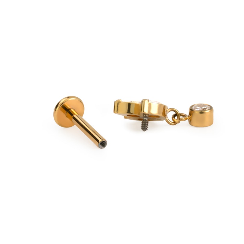 Dank des Innengewindes ist das Einsetzen und Herausnehmen dieses Labrets sehr angenehm, da der Teil, der durch dein Piercing geht, völlig glatt ist. Es besteht aus Titan, das hypoallergen, beständig und nicht anlaufend ist.