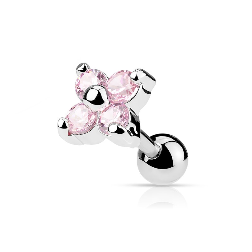 Hier bekommst du eine kleine süße Blume als Frontmotiv auf deinem Piercingstab, den du z.B. in einem Traguspiercing platzieren kannst. Der Schmuck ist 6 mm lang und 1,2 mm dick, Die Größe der Blume beträgt 8mm vom Ende zu Ende, so daß du die Blume natürlich auch in anderen Piercings anwenden kannst, wenn die Maße passen, z.B. in einem Helixpiercing oder ganz normal in deinen Ohrläppchen. Jedes Blütenblatt besteht aus einem funkelnden Stein und die Farbe dazu kannst du sogar selbst auswählen.