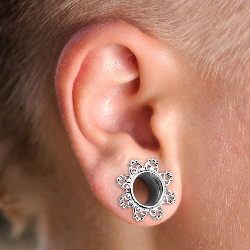 Die Rückseite des Schmuckes ist mit einem Schraubgewinde versehen worden, so daß du den Tunnel ganz leicht einsetzen kannst oder eben herausnehmen. Du mußt einfach nur die Rückseite abschrauben, den Tunnel vorsichtig in dein Stretch einführen und die dann die Rückseite wieder aufschrauben. Leichter kann es gar nicht sein.