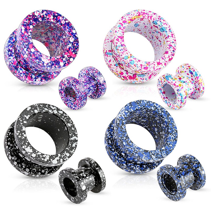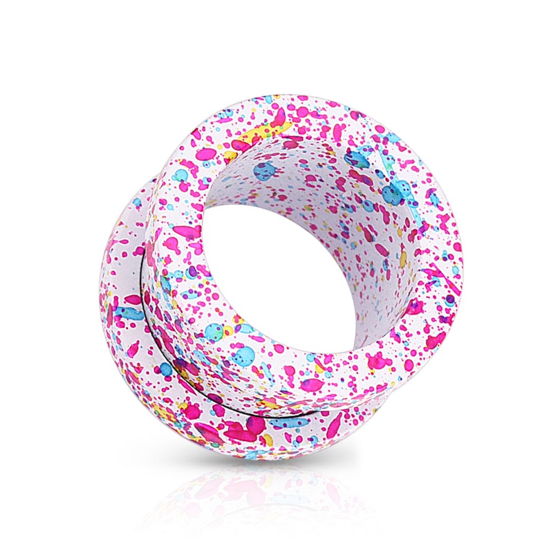 Hier ist der richtige Tunnel für alle, die es gerne farbig und gesprenkelt mögen.Dieser coole Tunnel wurde aus chirugischen Stahl hergestellt und ist in vielen verschiedenen Größen und Farben erhältlich - von 3 mm Durchmesser bis zu 16 mm Durchmesser. Der Tunnel wurde so designet, als wenn ein Maler seine Pinsel über den Schmuckstücken ausgeschüttelt hätte. Die schönen Spritzflecken sind immer in Farben gehalten, die mit der Grundfarbe harmonieren und sich somit ergänzen.