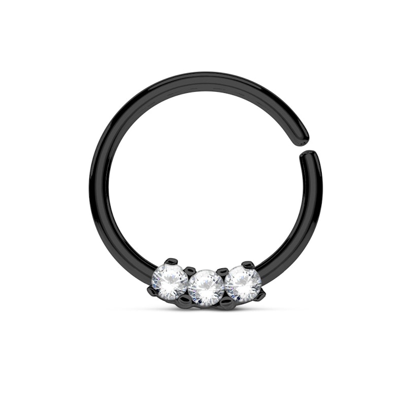 Schmuck für Septumpiercings ist meistens groß und auffällig, es sei denn man nimmt einen schlichten Kugel- oder Segmentring. Sobald aber Steine mit ins Spiel kommen, wird der Schmuck groß und voluminös. Aber nicht bei diesem schönen Septumschmuck, mit den schlanken Design und der drei kleinen Steinchen auf dem schmalen Ring.