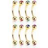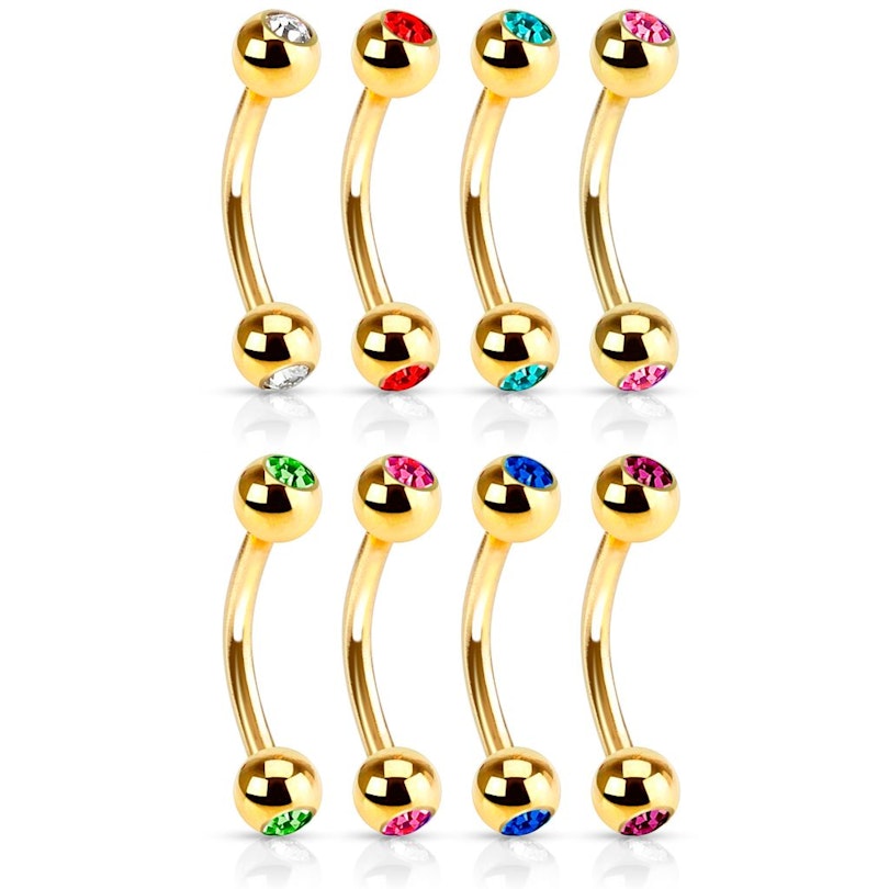 Dieser Schmuck wurde aus Chirurgenstahl hergestellt und im Anschluss vergoldet. In jeder der beiden Kugeln ist ein kleiner Stein. Dieser Schmuck ist in erster Linie für Augenbrauenpiercings konzipiert worden, kann aber natürlich auch für Brustwarzen- oder Intimpiercings verwendet werden.