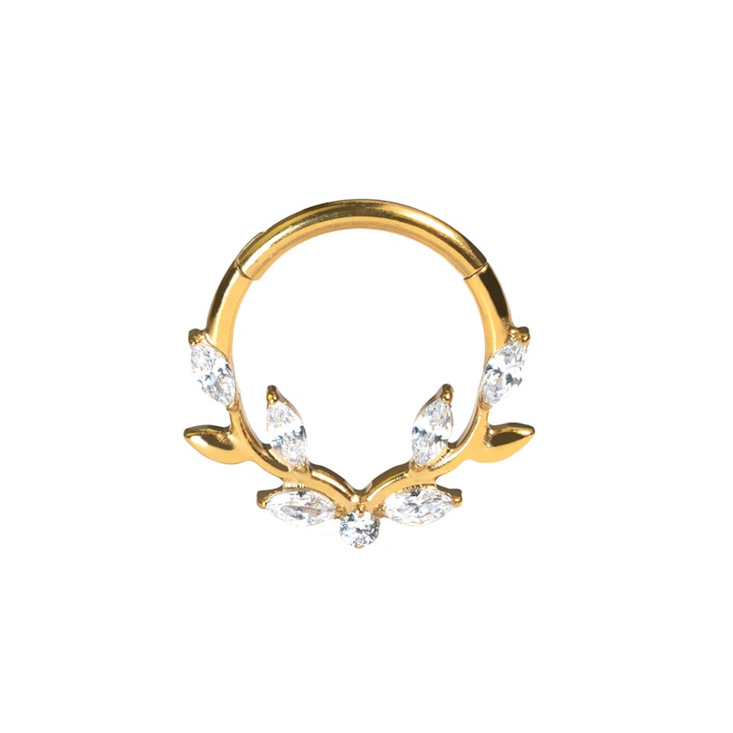 Dieser hochwertige, nach vorne gerichtete Clickerring mit schönem Weinblattdesign eignet sich hervorragend für Piercings wie Daith und Septum. Er besteht aus Titan und ist stark und hypoallergen. Eine tolle Ergänzung zu deiner Schmucksammlung.