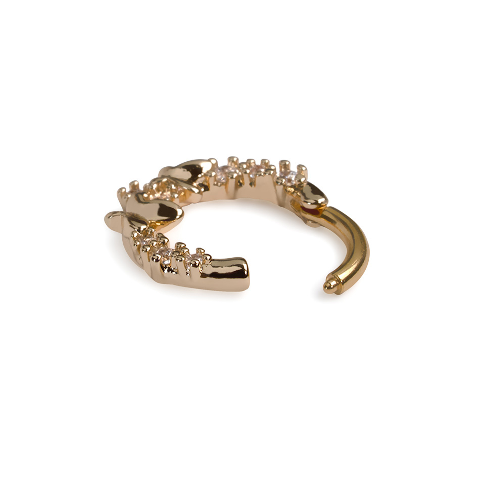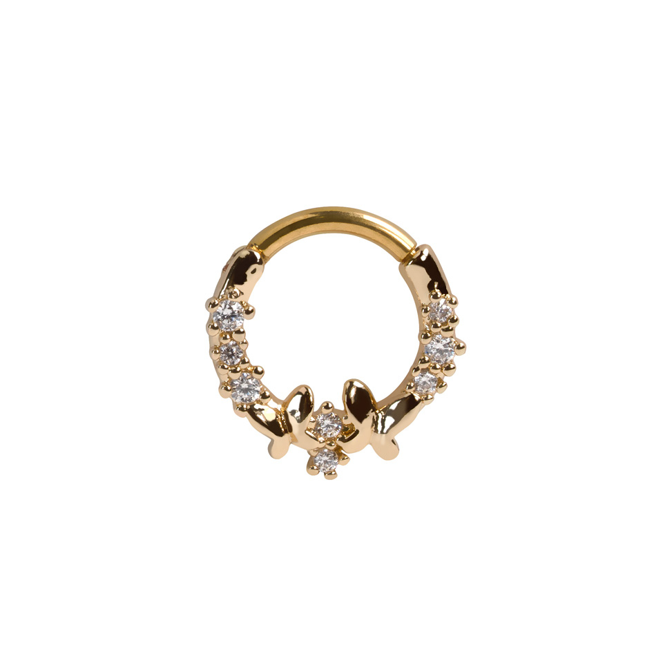Dieser super hübsche vorwärts gerichtete Ring ist mit zwei Schmetterlingen versehen, die von winzigen Zirkoniasteinen umrahmt werden. Da dieser Ring mit einem Scharnier versehen ist, lässt er sich leicht an deinem Piercing befestigen.