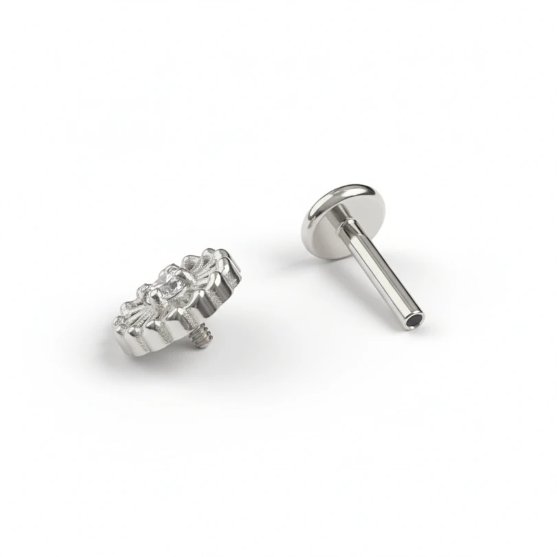 Es ist aus Titan gefertigt, also hypoallergen, wasserdicht und alltagstauglich. Das Innengewinde ermöglicht ein müheloses Einführen und sorgt für festen Halt, damit der Schmuck zuverlässig sitzt. Mit flacher Rückseite und für Conch-, Helix-, Ohrläppchen- oder Traguspiercings geeignet.